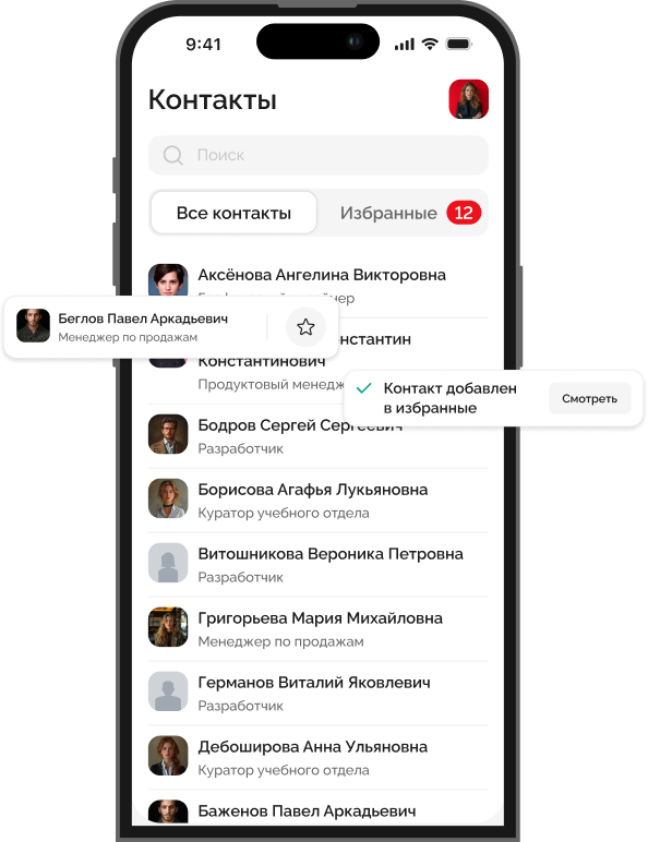 Ищите коллег по ФИО, просматривайте всю информацию о профессиональной деятельности, навыках и достижениях сотрудника